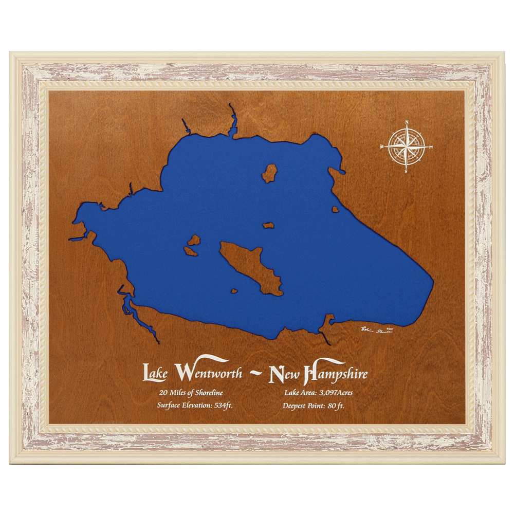 Lake Wentworth, New Hampshire Stained Wood and Distressed White Frame Lake Map Silhouette