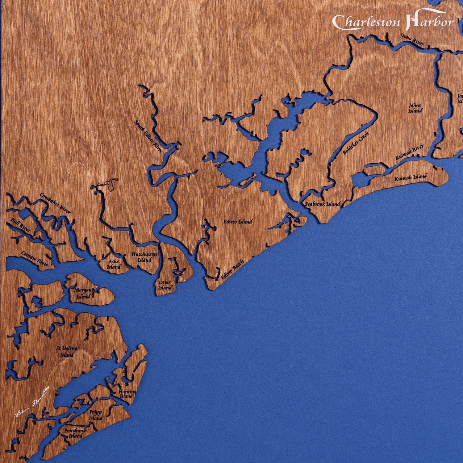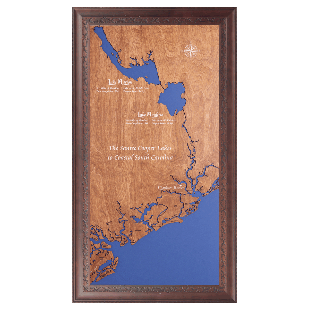 Santee Cooper Lakes to Charleston Harbor, South Carolina Stained Wood and Dark Walnut Frame Map Silhouette